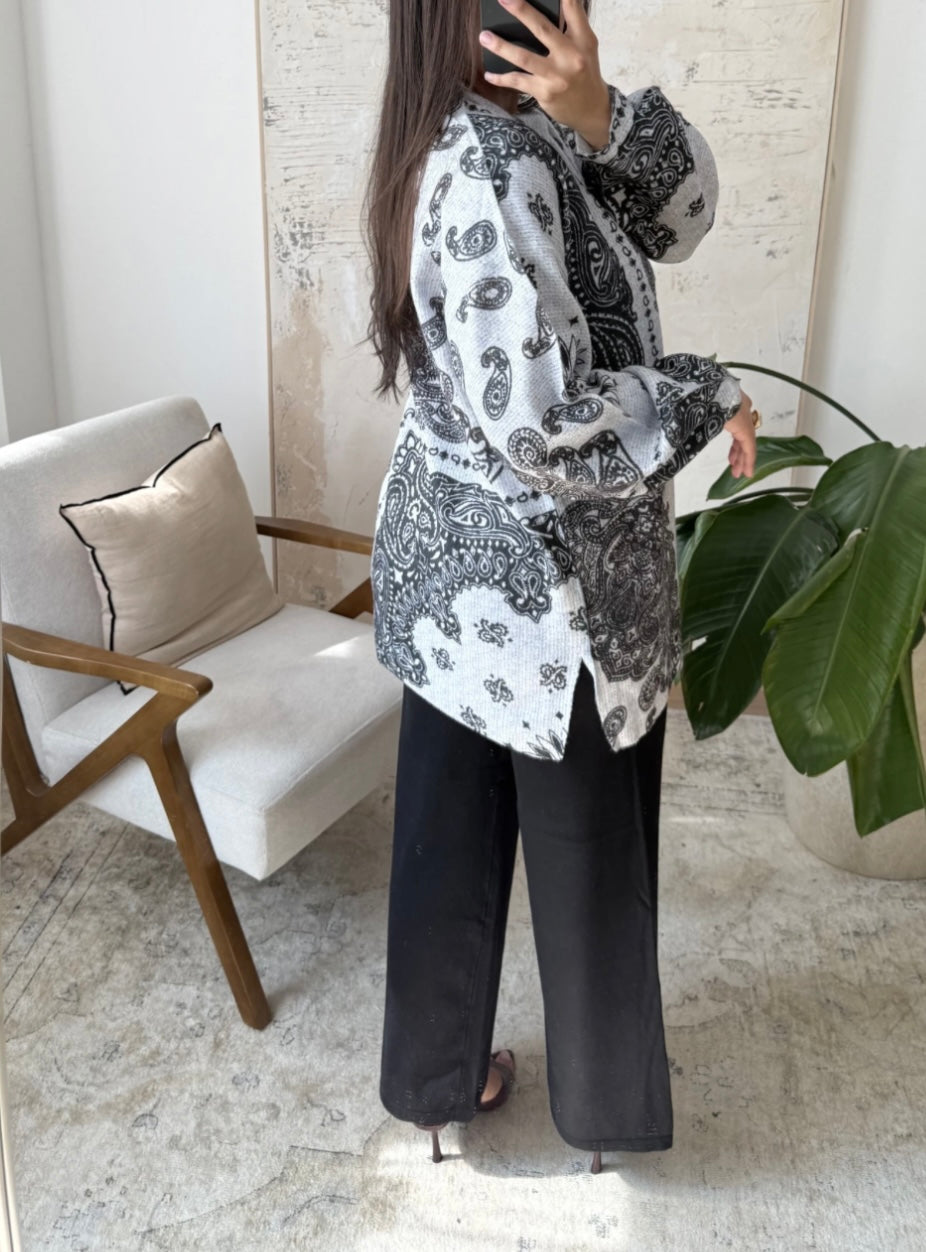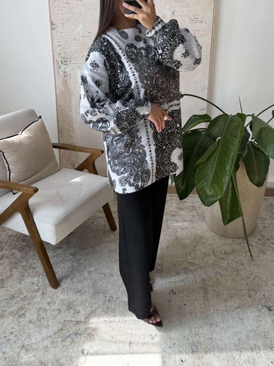 Tunique longue à encolure ronde, imprimé façon foulard en noir et blanc avec détails pailletés discrets, manches longues légèrement bouffantes + pantalon noir