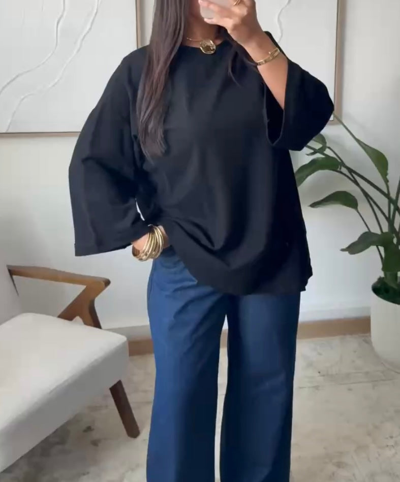 Modèle ample en maille douce, à coupe droite et manches longues larges. Confectionnée dans un mélange agréable de coton et viscose, cette pièce offre un tombé fluide et un toucher confortable. Sa coupe oversize permet une grande liberté de mouvement et s’adapte à toutes les morphologies.Un basique incontournable pour une clientèle à la recherche de pièces décontractées, faciles à associer en boutique avec des pantalons larges, jeans ou jupes longues.