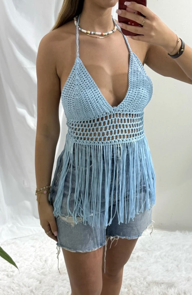 Haut de plage, en crochet Existe en plusieurs couleurs, noir, blanc, rose, bleu, beige