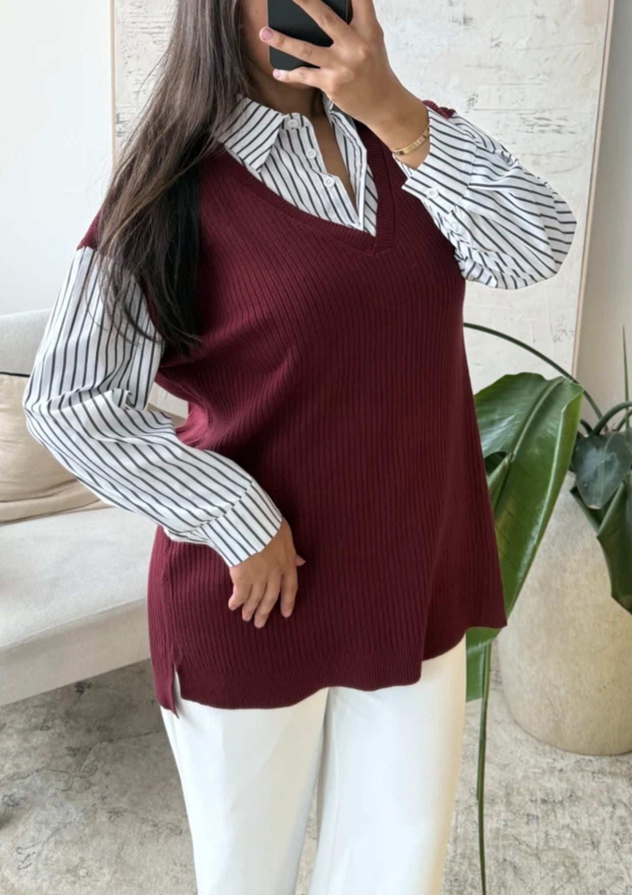 Tunique taille unique composée d'une chemise blanche à rayures à col classique cousue sous une tunique sans manches en maille côtelée, coupe droite et longueur couvrante idéale pour une silhouette discrète et élégante, finition soignée avec col rigide et emmanchures confortables, disponible en 6 coloris.